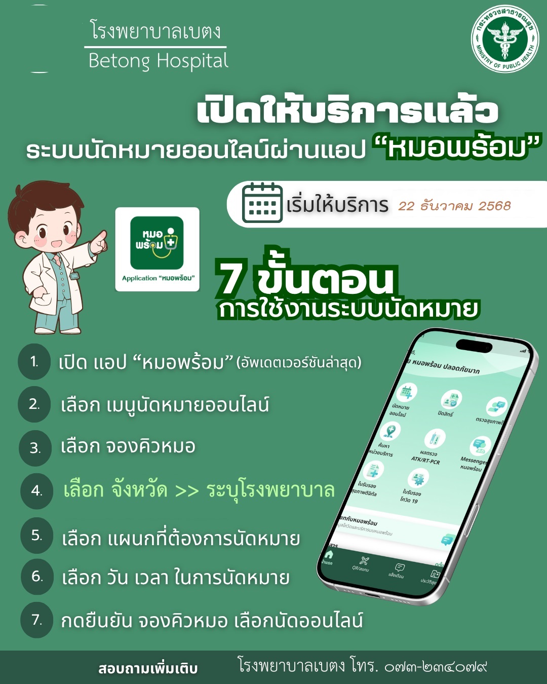 " โรงพยาบาลเบตง เปิดให้มีการจองคิวรับบริการ ผ่านช่องทางออนไลน์ application "หมอพร้อม" "