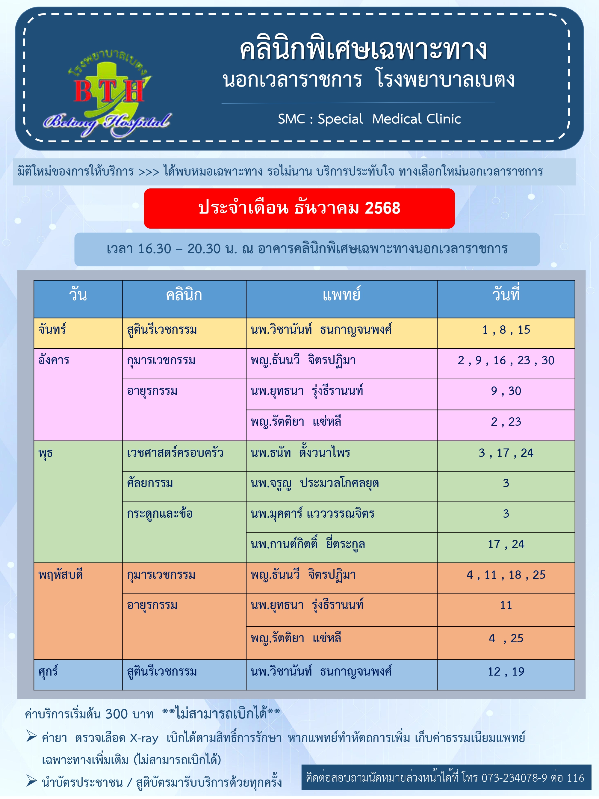 คลินิกที่ให้บริการตรวจรักษาโดยแพทย์เฉพาะทางนอกเวลาราชการของโรงพยาบาลเบตง เพื่อลดความแออัดและเพิ่มทางเลือกในการรับบริการให้กับประชาชนทั่วไป